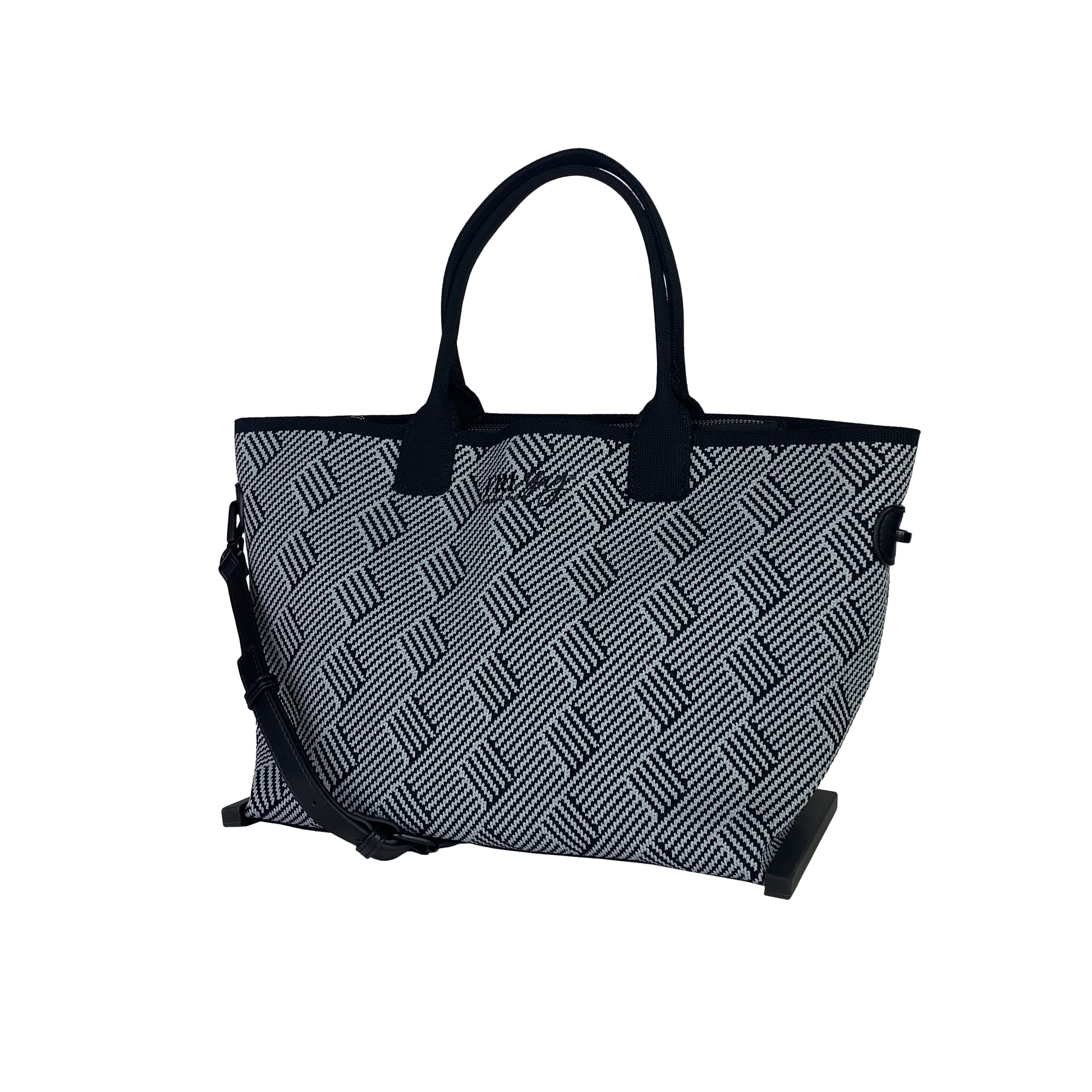 Dettagli manici, fondo, attacchi tracolla laterali e tasca porta telefono in maglia nera