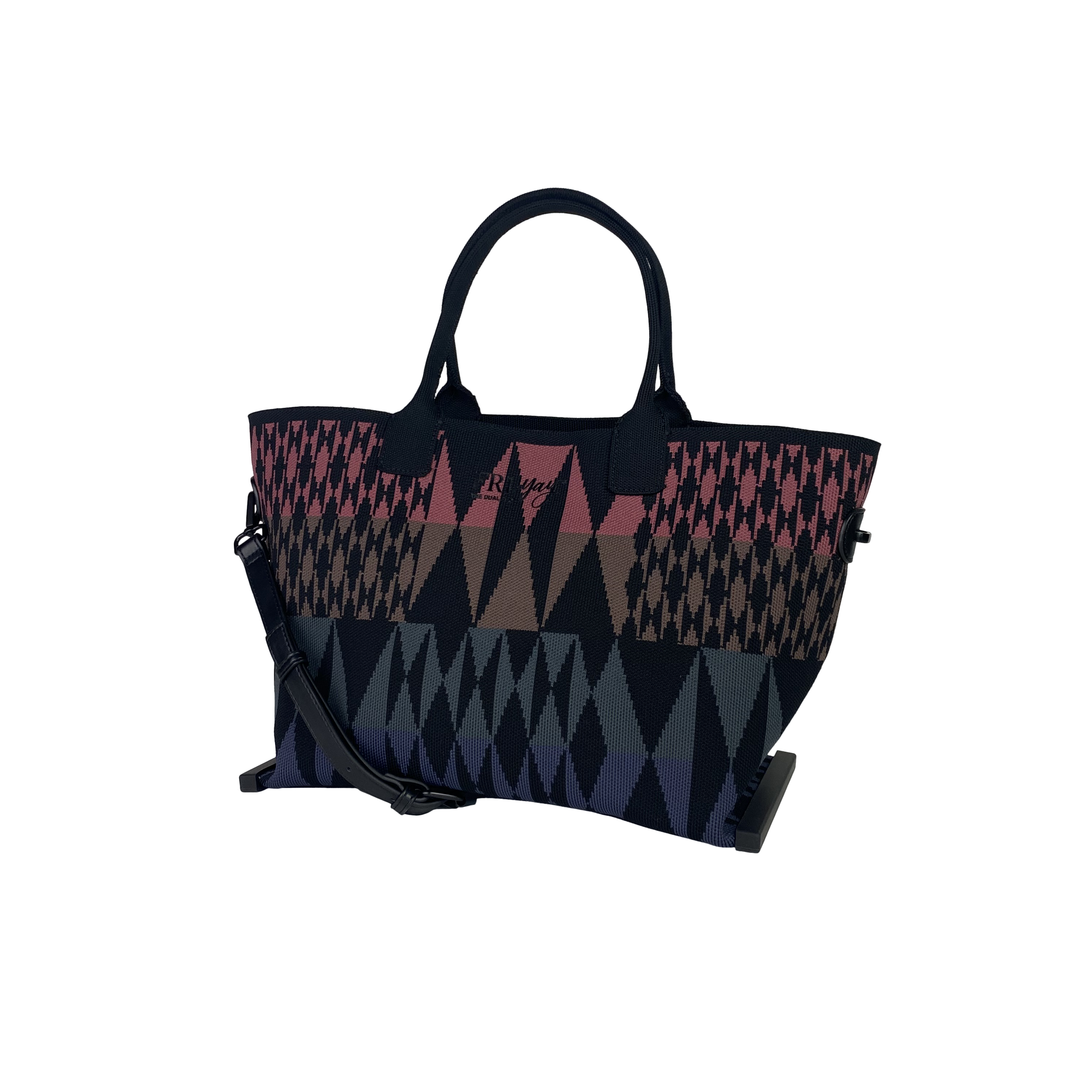 Dettagli manici, fondo, attacchi tracolla laterali e tasca porta telefono in maglia nera