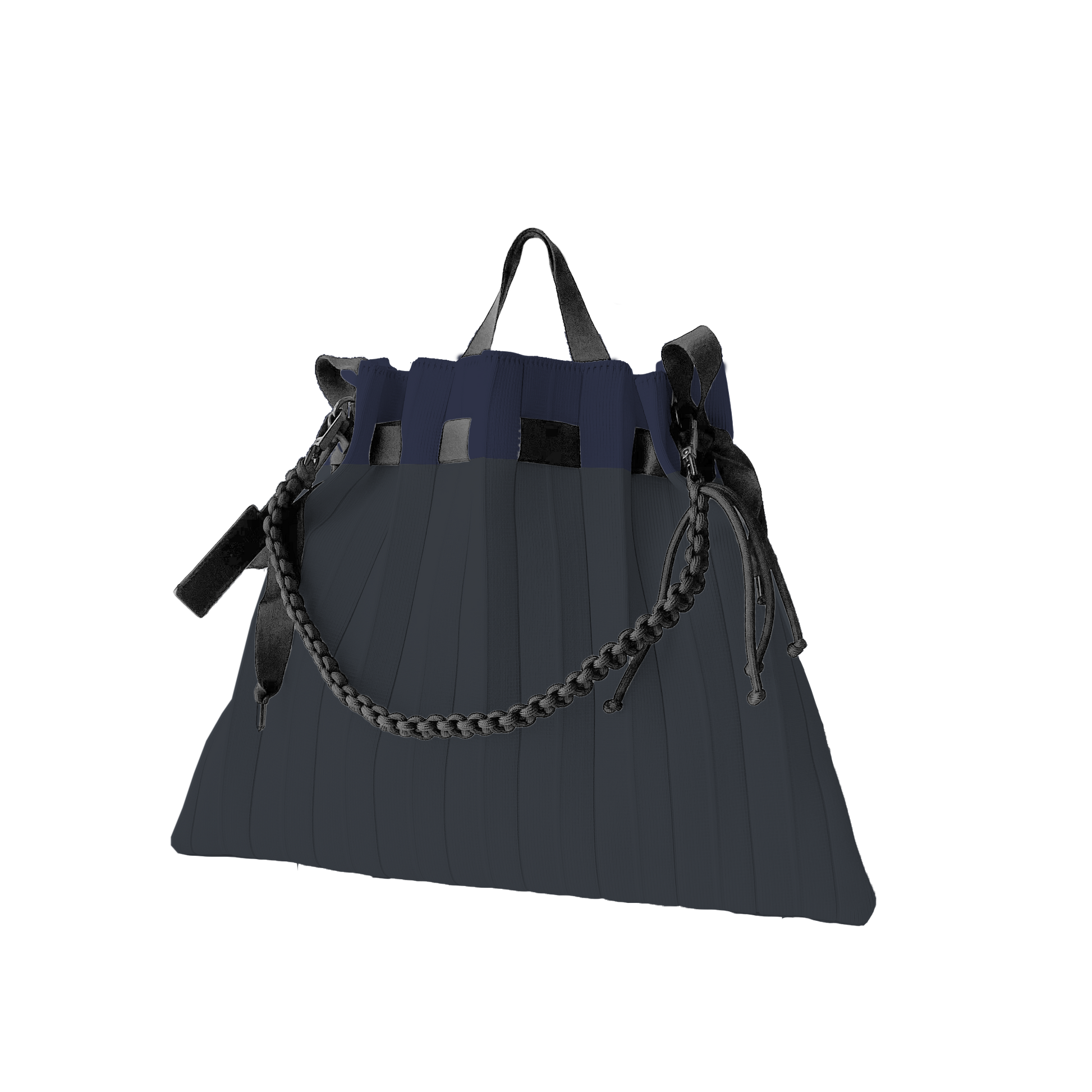 Tote bag a secchiello in maglia a punto plissé con chiusura coulisse, spallotto in corda intrecciata con moschettoni, tracolla in eco pelle regolabile con fibbia lunga 100-110 cm (inclusa)