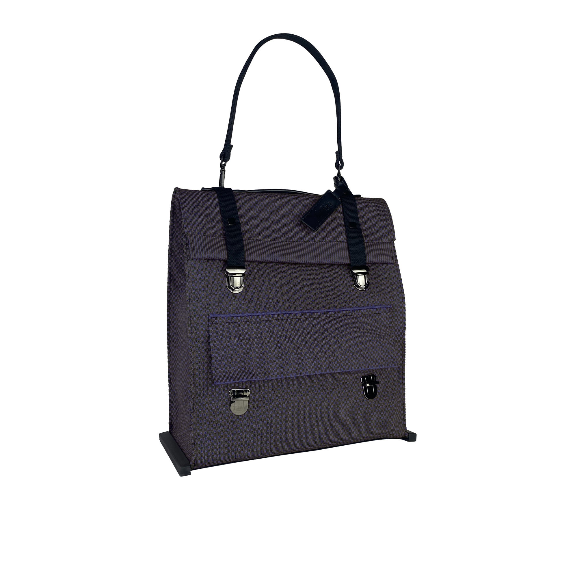 Questo modello può essere portato a spalla, grazie allo spallotto in maglia, o come zaino, grazie alle doppie tracolle in nastro scorrevole.