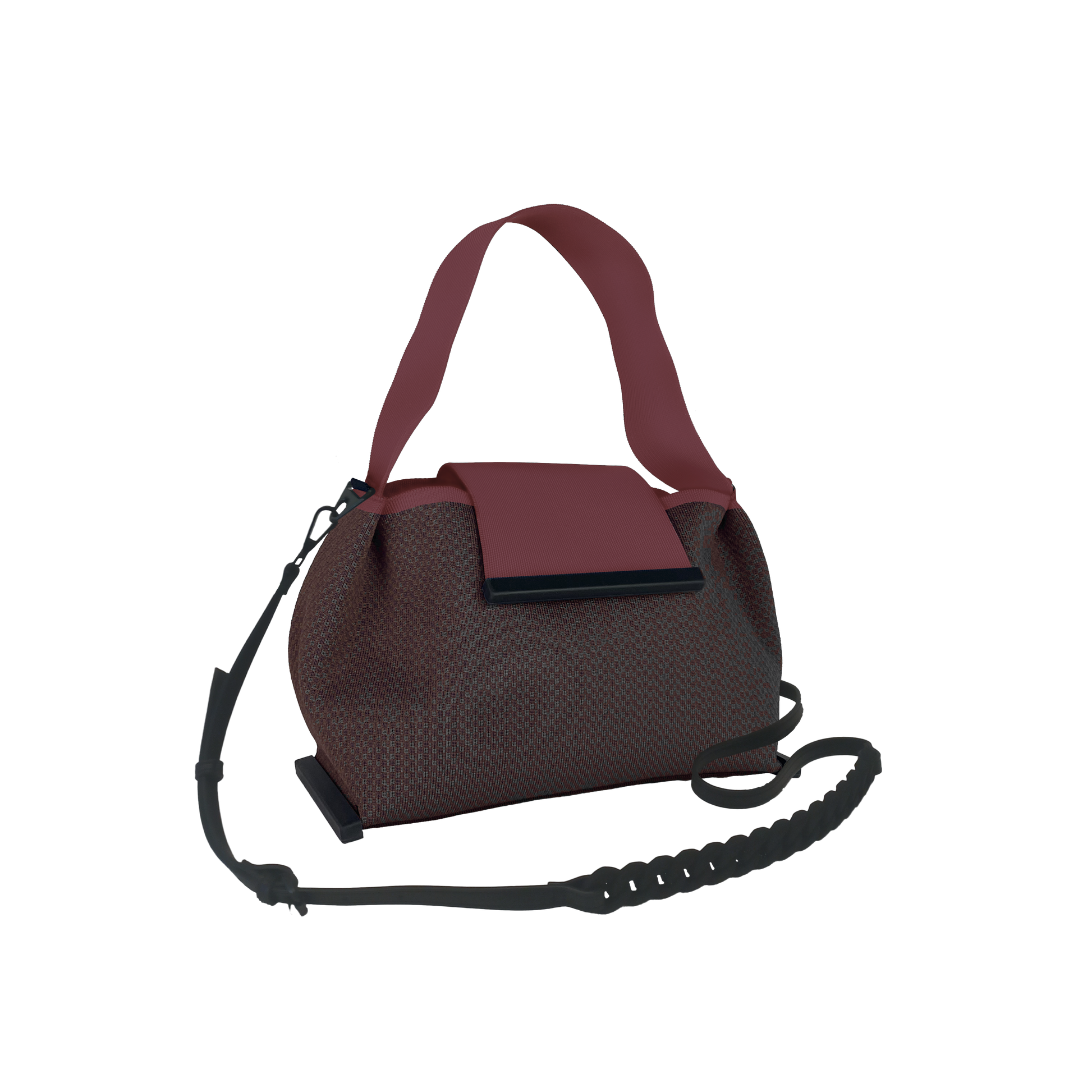 Esternamente la borsa è chiusa da una pattina in maglia, che sul retro crea una tasca porta telefono.