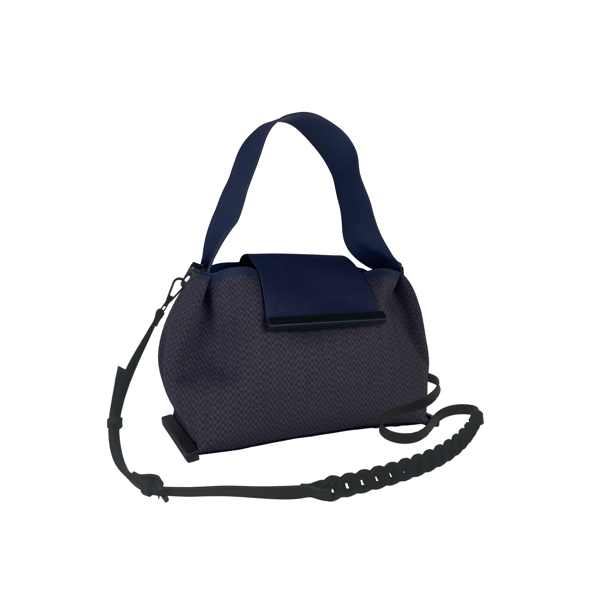 Esternamente la borsa è chiusa da una pattina in maglia, che sul retro crea una tasca porta telefono.
