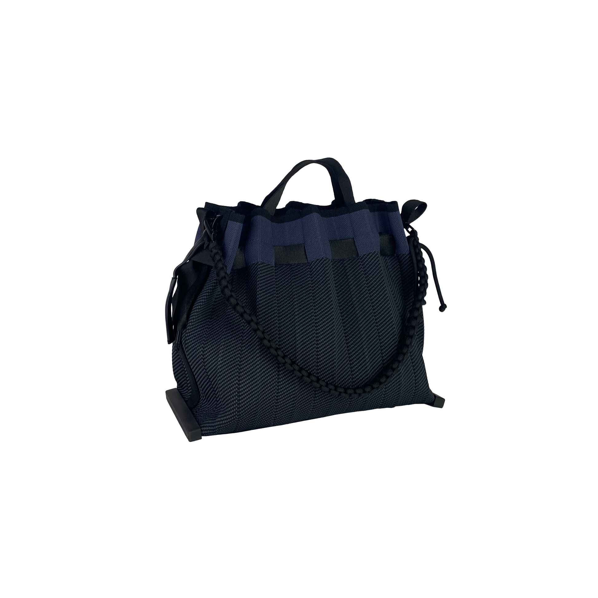Borsa a secchiello in maglia a punto plissé con chiusura coulisse, spallotto in corda intrecciata con moschettoni, tracolla in eco pelle regolabile con fibbia lunga 100-110 cm (inclusa)